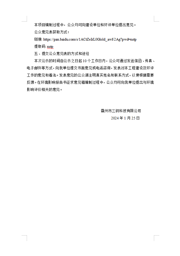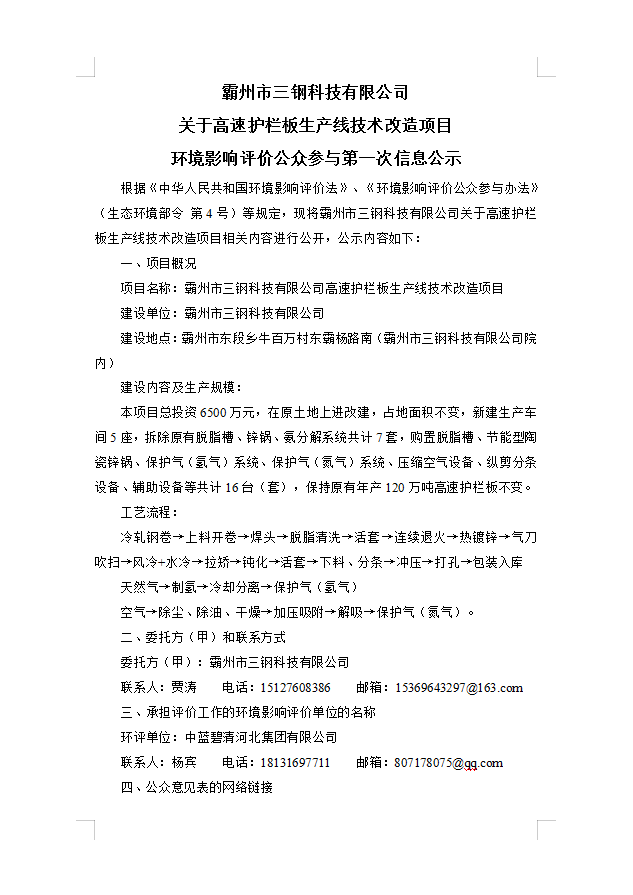 霸州市三鋼科技有限公司 關(guān)于高速護(hù)欄板生產(chǎn)線技術(shù)改造項(xiàng)目 環(huán)境影響評(píng)價(jià)公眾參與第一次信息公示